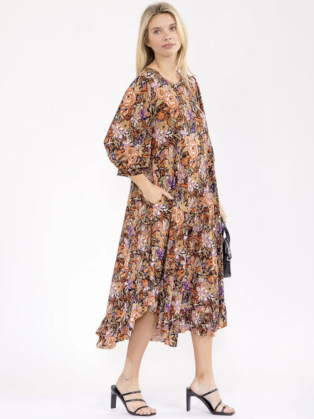 Expertly crafted for versatility and style, our 3/4 sleeve dress features a front pocket and a loose, comfortable fit. Highlighted by a beautiful floral print, this maxi dress also boasts a high low ruffle hem for a touch of elegance. Available in true-to-size options.