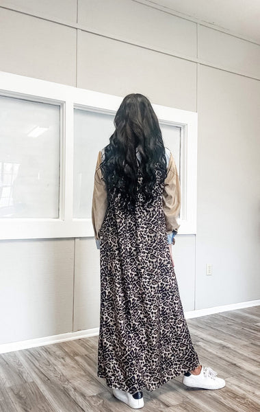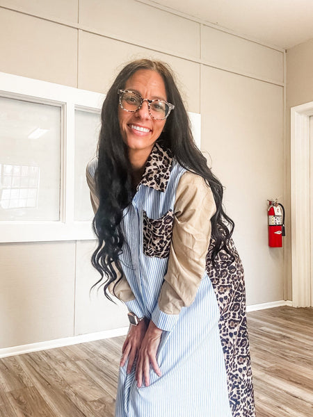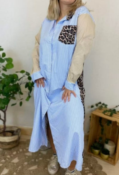 The Animal Print Patchwork Shirt Dress combines a variety of stylish elements, including leopard print, blue stripes, and tan sleeves. With its button-up style, collar, and maxi length, this dress has a sophisticated and polished look. Made from lightweight and flowy blouse material, it offers a roomy and comfortable fit.