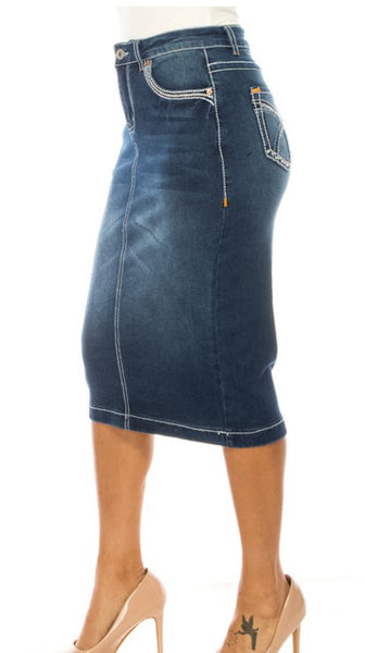 Expertly crafted with a dark wash, this denim midi skirt boasts a sleek no-slit design, accented with intricate stitch details. A button closure adds a touch of sophistication to this versatile piece. Perfect for elevating your casual or dressed-up look.
