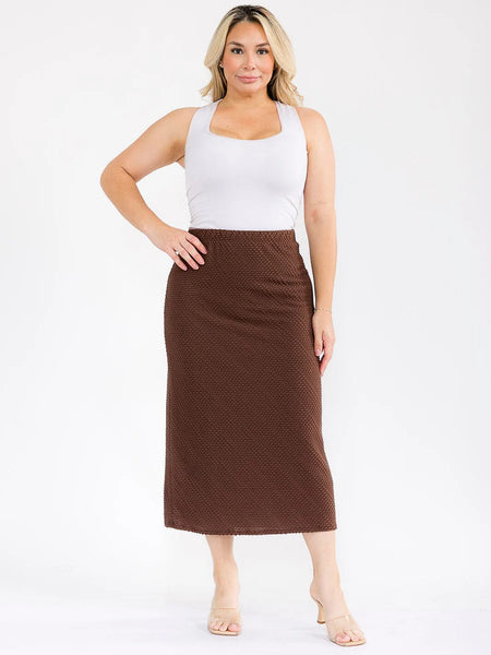 This brown skirt boasts a longer length, textured material, and a fitted elastic waist for a comfortable and stylish fit. A classic brown color to complement your wardrobe. Stretchy material but size up for a roomier fit.
